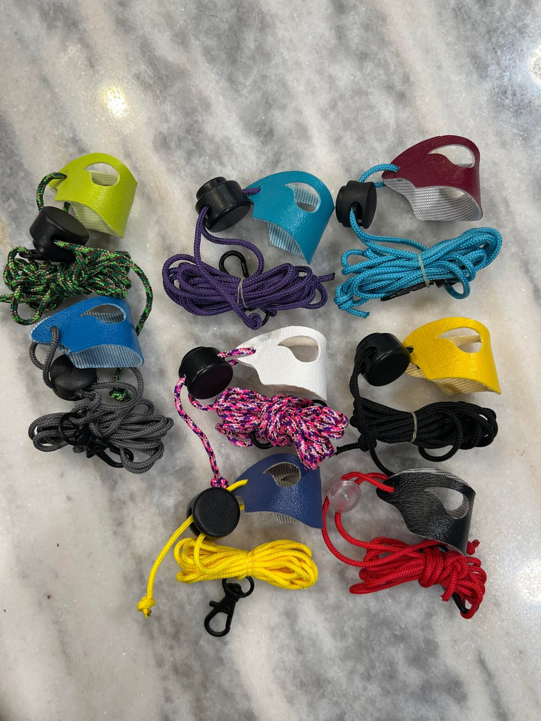 Harnesses are made from marine grade vinyl, paracord and a clip at the end to secure to yourself for added safety. Plus they look awesome!